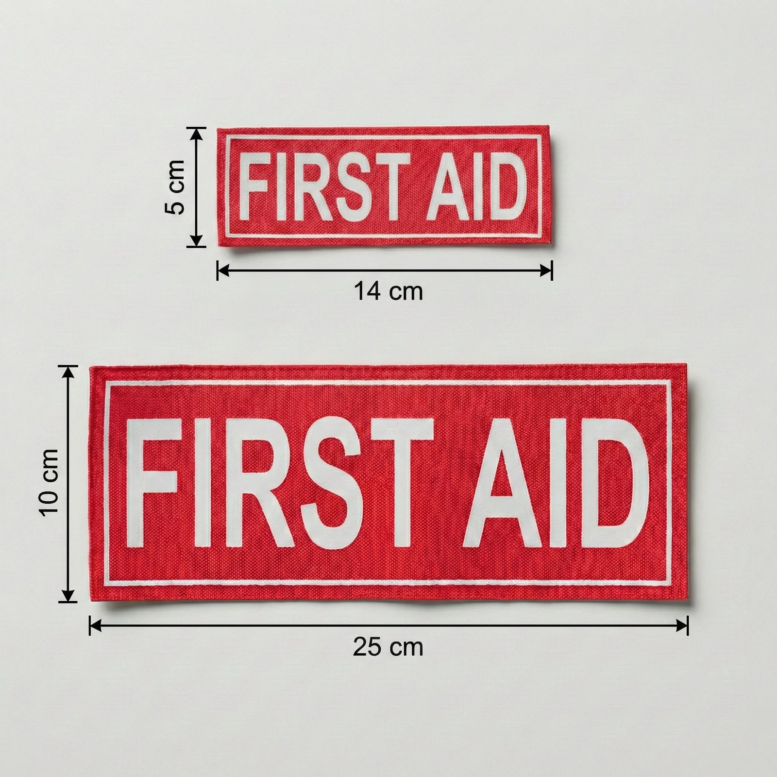 Professional FIRST AID fabric badge in high-visibility red, designed for clear medical role identification in workplaces, events, and emergency response environments. Ensures first aiders can be quickly recognised when assistance is needed.